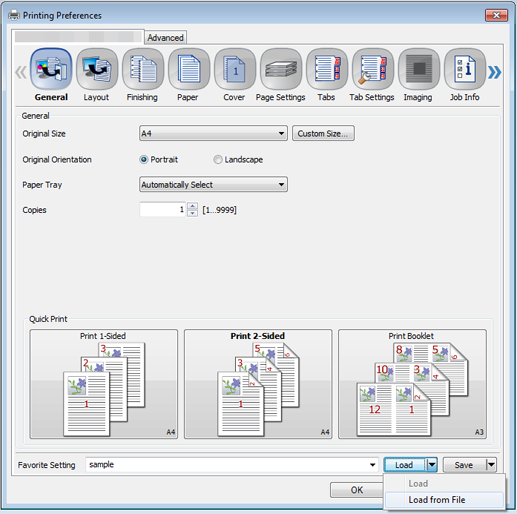 supplementary explanationIf you select Load from File in the Load pull-down menu, you can open data (print setting file) written to the file and recall the desired setting.