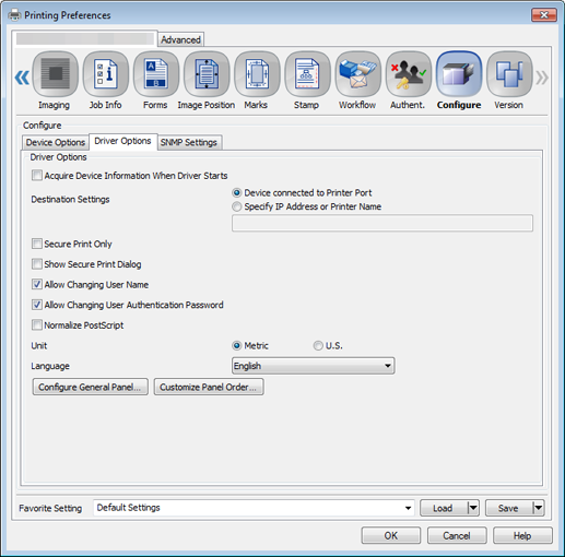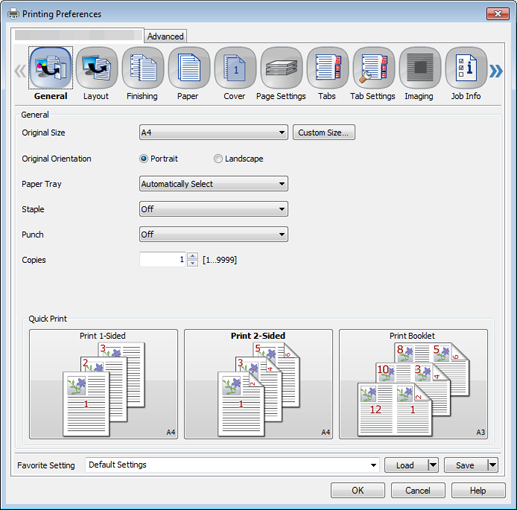Favorite Setting is available only for the PS Plug-in driver and PCL driver. General is available only for the PS Plug-in driver, and My Tab only for the PCL driver. These functions are not available for other drivers.