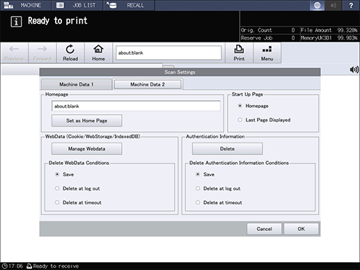 supplementary explanationTo delete User Name and Password that are stored, press Web Browser on the MACHINE screen, select Menu - Settings - Settings, and press Delete in Machine Data 2.