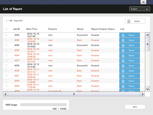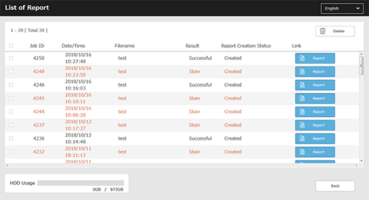 If the HDD capacity of the Auto Inspection Unit UK-301 reaches 100%, no report is created. Select an unnecessary report, and press Delete to delete data.