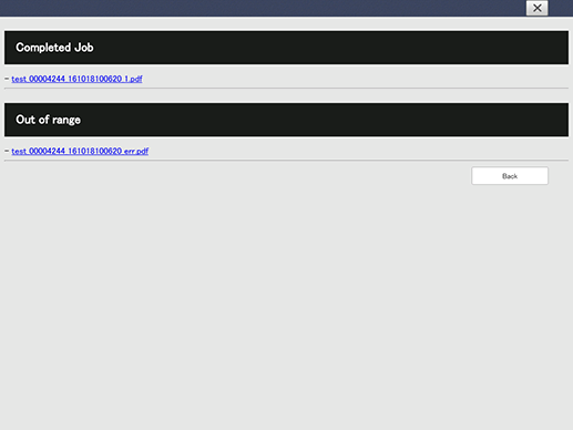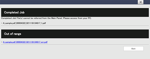 supplementary explanationPressing on the upper right of the screen returns to the MACHINE screen. Pressing Close on the lower right of the screen returns to the Completed Job, Out of range screen.