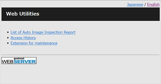 This displays the top page of Web Utilities of the Auto Inspection Unit UK-301.