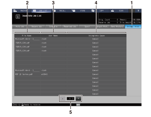 The Incomp. Hist. screen of the JOB LIST screen provides a list of the past 100 incomplete job histories.