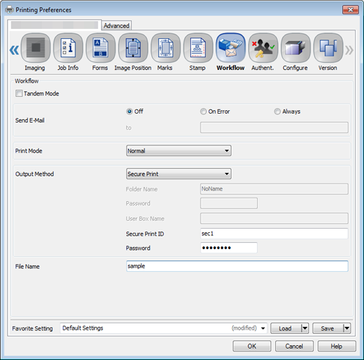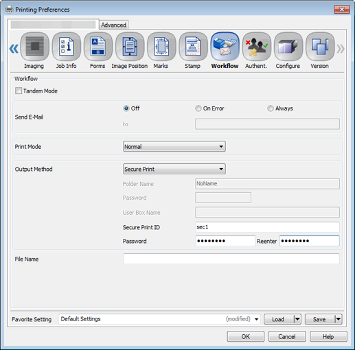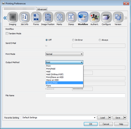 3. Click the Workflow tab, and then select Secure Print in the Output Method pull-down menu.