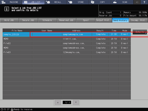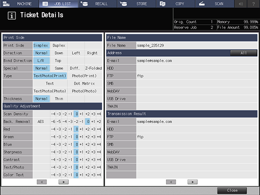 7 | Mode | Displays a send job mode (Email, HDD, FTP, SMB, WebDAV, USB, or TWAIN). When selecting multiple destinations, only one destination is displayed. (The order of priority is: Email - HDD - FTP - SMB - WebDAV - USB - TWAIN) |