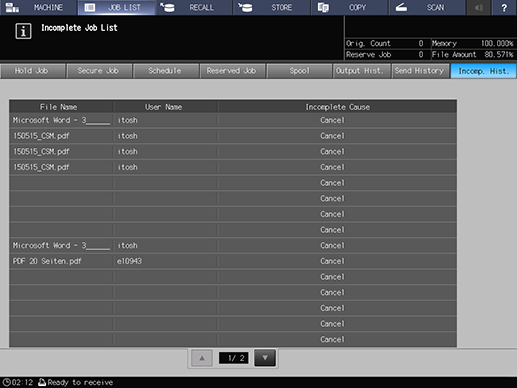1 | Incomp. Hist. | Press to display the Incomplete Job List screen. |