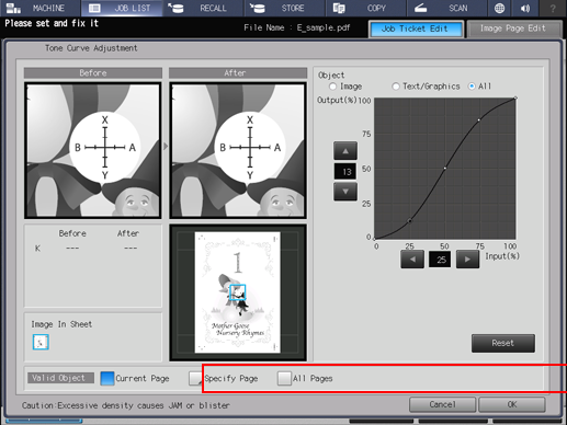 supplementary explanationWhen you press Specify Page, the Specify Page dialog is displayed. Enter the page number with either the keypad on the screen or the keypad on the control panel. When specifying the pages, delimit the page with ,. When specifying the range, use -. Press OK to return to the Tone Curve Adjustment dialog.