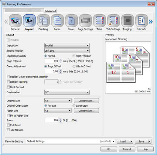 When setting in the printer driver, make sure that there are no previous settings left in each item in the tabs Layout, Finishing, Cover, etc.