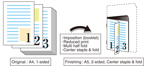 To create a Fold & Staple booklet, Saddle Stitcher SD-506, Saddle Stitcher SD-513, or Finisher FS-532 equipped with Saddle Stitcher SD-510 is required.