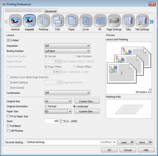 When setting in the printer driver, make sure that there are no previous settings left in each item in the tabs Layout, Finishing, Cover, etc.