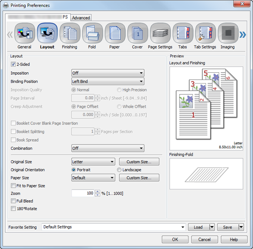 Original Size | The paper sizes registered as the standard paper sizes and custom sizes | Set a paper size of the original. When you select the PostScript Custom Page Size, the size specified by Custom Size is used. In addition, when you register the Custom Paper Size Name using the Custom Size - Add Custom Size, you can also select the name of the size. |