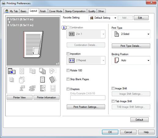 Imposition | Off, On 2 Repeat, 2 Repeat Reversal (U), 2 Repeat Reversal (D), 2 Repeat Reversal (L), 2 Repeat Reversal (R), 2 in 1, 4 Repeat, 4 in 1 (Vertical), 4 in 1 (Horizontal), 8 Repeat | Set this to perform an imposition printing. Outputs onto paper in twice or quadruple the size specified in the Original Size. For example : When the Paper Size is A4, the document is printed with A3 sheet. |