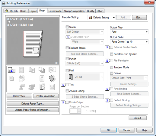 Output Order | Face Down (1 to N), Face Down (N to 1), Face UP (N to 1), Face Up (1 to N) | Select Face Up to output printed paper with its face up. If you want to print an original in a reverse order, select N to 1. |