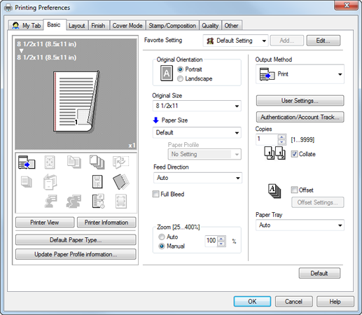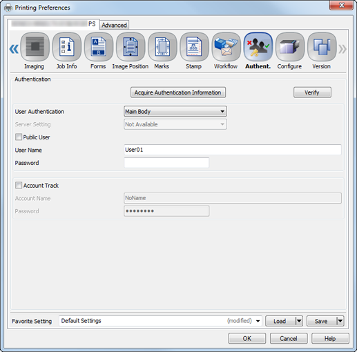 When User Authentication is set on the main body, a user name and password must be entered when printing.