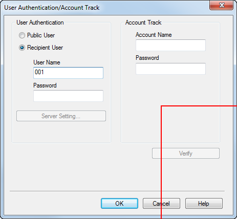 If an account is registered in Account Track Settings on this machine, enter the account name registered in this machine, and if necessary, enter the password. For details about Account Track Settings, refer to Account Track.