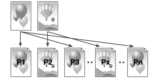 When a form has two pages, form page 1 is assigned to the first page of the job, form page 2 to the second page of the job, and form page 1 to the third page again as shown below. This pattern is repeated.