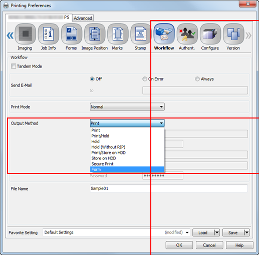 supplementary explanationIf the resolution of the form is different from that of the job, the form name is dimmed, which means the form is not available.