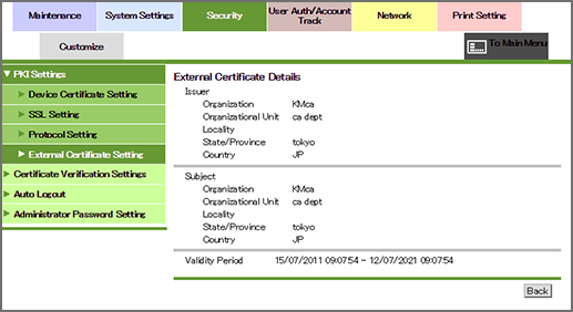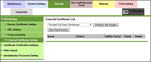 Click PKI Settings - External Certificate Setting on the menu of Security tab to display this screen.