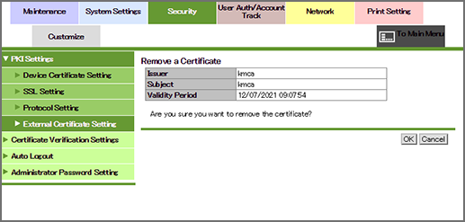 • supplementary explanationClicking Cancel aborts the operation, and the certificate is not removed.