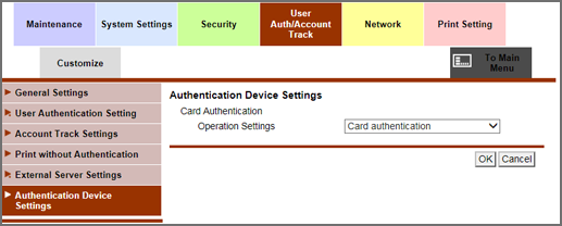 In Authentication Device Settings - Operation Settings, select Card authentication or Card Authentication + Password.