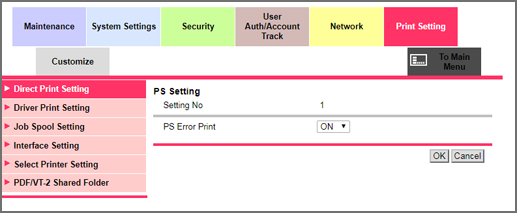 2. Select either ON or OFF from the PS Error Print drop-down list.
