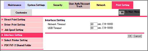 Click Interface Setting on the menu of Print Setting tab to display this screen. This setting can be made also from Controller on the MACHINE screen. For details about the setting, refer to I/F Timeout.