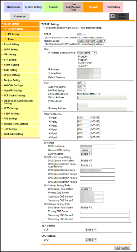 TCP/IP Settings | Configure the TCP/IP setting when connecting this machine via network. For details, refer to TCP/IP Setting, IP Filtering, Overview of IPsec Setting. |