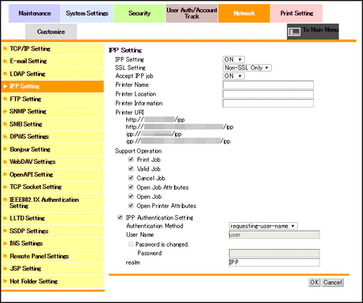 This screen allows you to make IPP (Internet Printing Protocol) settings.