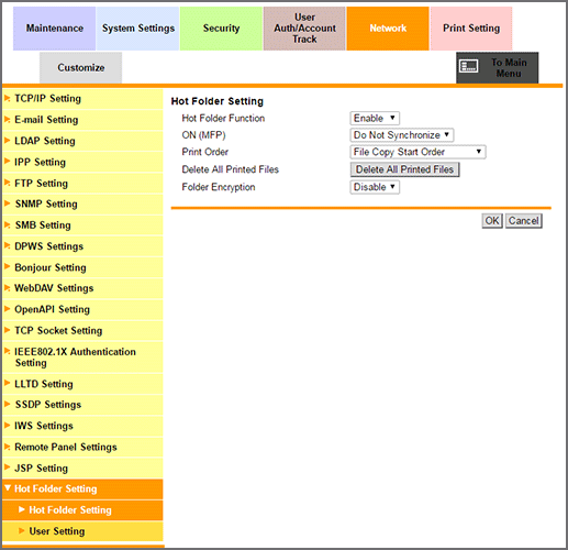 Click Hot Folder Setting - Hot Folder Setting on the menu of Network tab to display this screen.