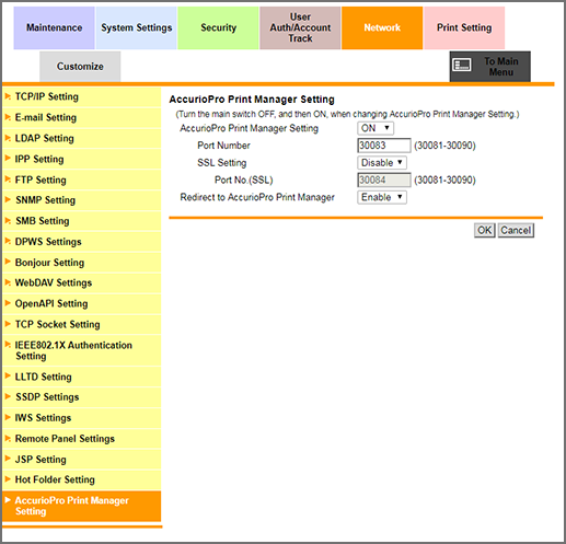 Click Print Manager Setting on the menu of Network tab to display this screen.