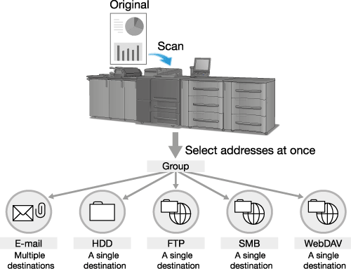 If you register multiple destinations as a group, you can send or save the data scanned from the ADF or the original scanning glass (scan data) to them at one time.