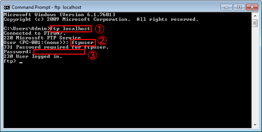supplementary explanationIf the access to the FTP site fails, enter ftp 127.0.0.1.