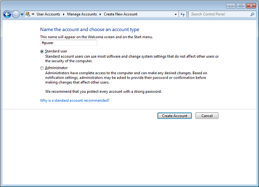 Enter an account name and make sure Standard user is selected, and then click Create Account.