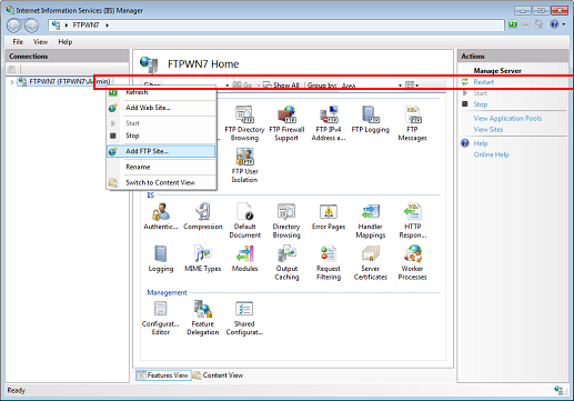 Click Start - Control Panel - System and Security - Administrative Tools - Services in sequence, select Microsoft FTP Service and click Restart the service.