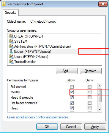 Select the user name entered in step 15 and add a check mark to Modify of Allow. Click OK.