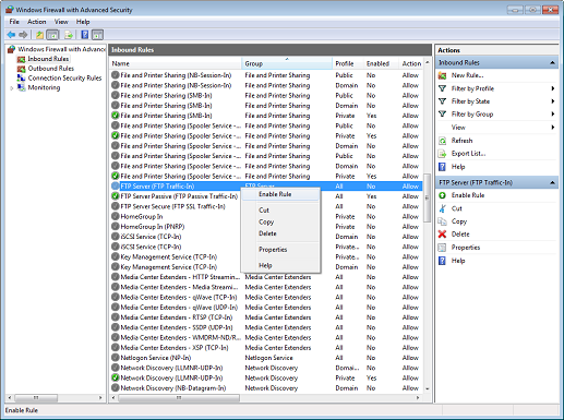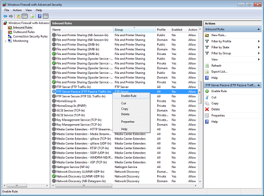 Select Inbound Rules and right-click FTP Server Passive (FTP Passive Traffic-In), and then click Enable Rule.