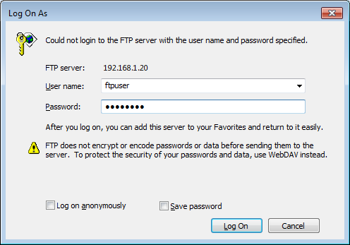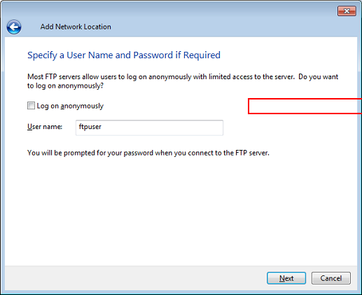 Remove the check from Log on anonymously and enter the user name, and then click Next.