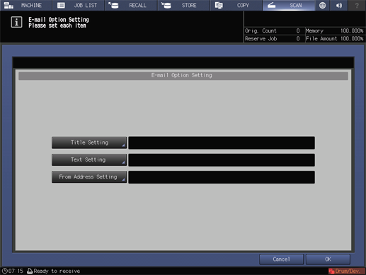 Press OK on the E-mail Option Setting screen to return to the SCAN screen.