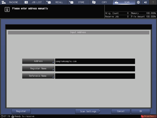 supplementary explanationThe settings on the Scan Settings screen and the address selected on the SCAN screen may remain until the machine is restarted. It is recommended to release the setting and address once the operation is completed.