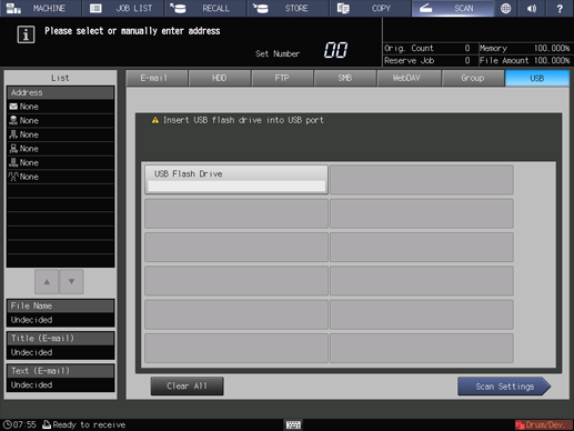 supplementary explanationThe settings on the Scan Settings screen and the address selected on the SCAN screen may remain until the machine is restarted. It is recommended to release the setting and address once the operation is completed.