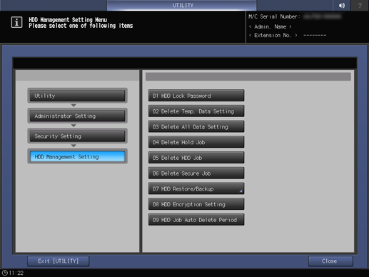 Press Security Setting on the Administrator Setting Menu screen, and then press HDD Management Setting and Delete All Data Setting in sequence.