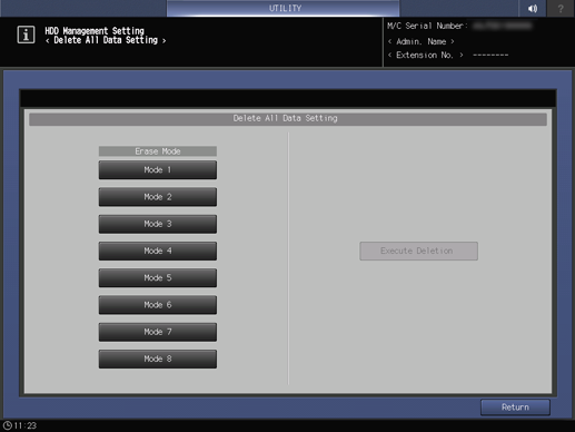 Select the desired erase mode to delete all the data on the HDD or the non-volatile memory of this machine with a specific data. Also execute deleting all the data. Use this function when disposing of the machine.