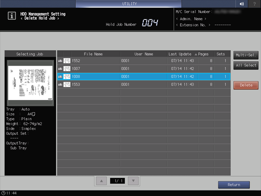 Press Security Setting on the Administrator Setting Menu screen, and then press HDD Management Setting and Delete hold Job in sequence.