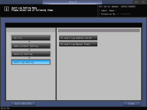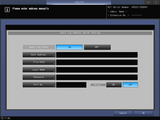 On the Administrator Setting Menu screen, press Security Setting - Audit Log Setting - Audit Log Address Server.