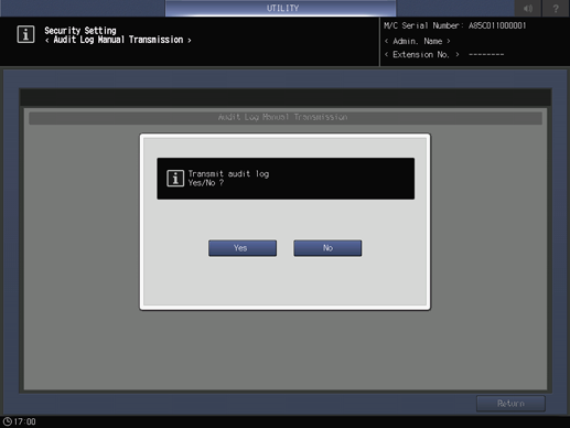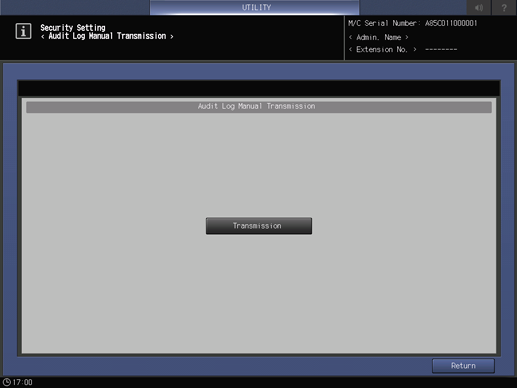 On the Administrator Setting Menu screen, press Security Setting - Audit Log Setting - Audit Log Manual Trans..