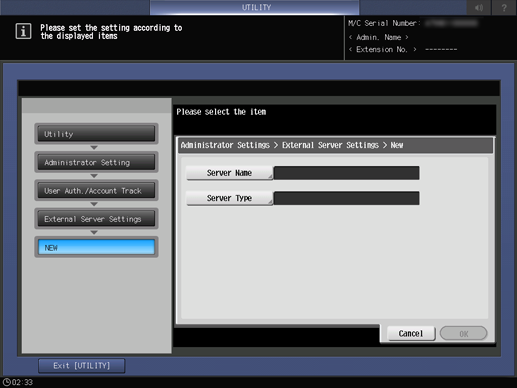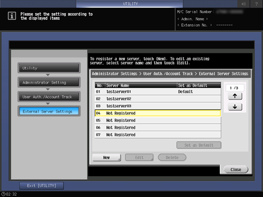 Select an unregistered (or blank) line on the External Server Settings screen, and press New to register a new external server.