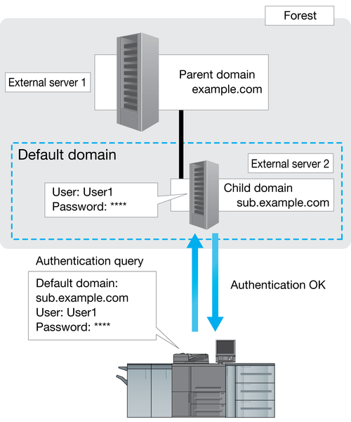 * For example, if a child domain (sub.example.com) contains a server with an authentication user registered, the sub domain is used as the default domain.