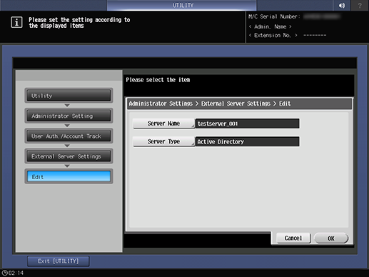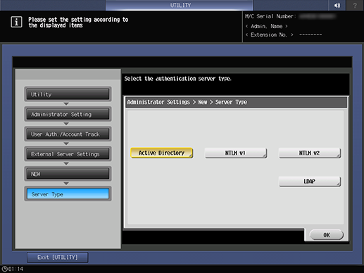 Press User Auth./Account Track on the Administrator Setting Menu screen, and then press External Server Settings.
