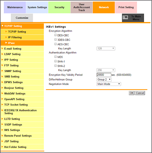 1. In the Network tab, click TCP/IP Setting - IPsec to display the IPsec operation selection screen.