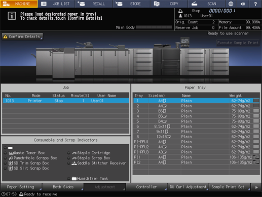 Please load designated paper in tray$ / To check details, touch [Confirm Details]